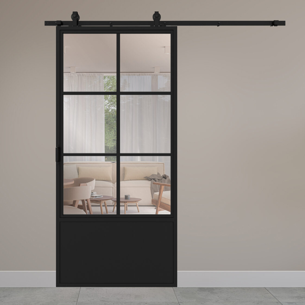 Breng een modern industrieel accent in je interieur met de stalen schuifdeur 6-vlaks helder glas, uitgevoerd met een praktische kickplate. Het ontwerp met zes vlakken geeft de deur een elegant lijnenspel en visuele structuur, terwijl de kickplate de onderzijde beschermt tegen stoten en slijtage.