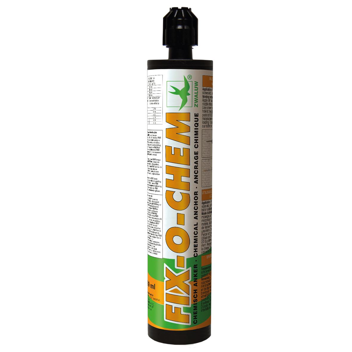 Zwaluw Fix-O-Chem is speciaal ontwikkeld voor het “heavy-duty” verankeren van draadeinden, bouten en schroeven in massieve en holle ondergronden als beton, cellenbeton, licht gewicht beton, metselwerk en steen. Als synthetisch reparatiecement voor beton. Zwaluw Fix-O-Chem kan gebruikt worden gedurende de houdbaarheid door eenvoudig de statische mixer en de schroefdop op de koker te vervangen.